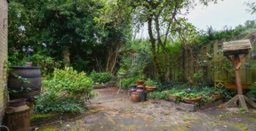 De zonnige achtertuin ligt ideaal op het zuidwesten en is ca 9,5 m diep en ca. 8,5 m breed. Doordat de tuin grenst aan een groenstrook van de gemeente zit je helemaal vrij, er is geen directe bebouwing en is er dus veel privacy.