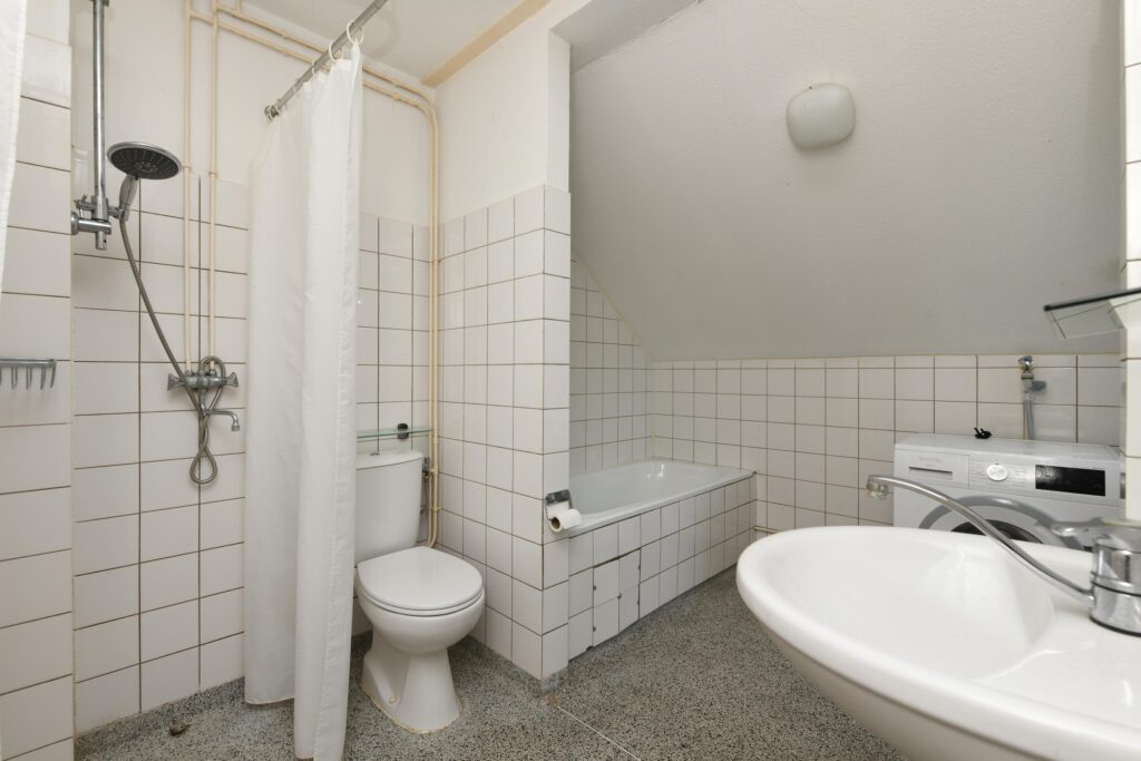 ruime overloop met 3 grote slaapkamers, ruime badkamer met bad, 2e toilet, wastafel, douche en wasmachineaansluiting en een te openen raam.