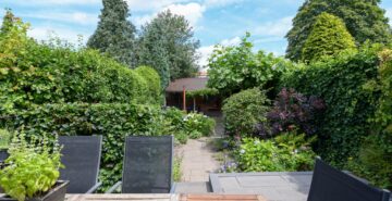 In de tuin vind je een grote bergschuur van 5,4 meter bij 3,8 meter (21m2). De schuur is geïsoleerd, heeft een overkapt houten vlonderterras en is uitgerust met bekabeld internet, warm en koud water en gas en licht, dus ook ideaal als werkplek.