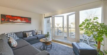 kleine overloop, ruime zit- annex tv- hoek en ruime en ‘lichte’ living gelegen aan de voorzijde van de woning met toegang tot het fraaie balkon. Op dit balkon kunt u vanaf ca. 15.00 uur tot in avond van de zon genieten en als het ware de zon in het Gooimeer zien zakken.