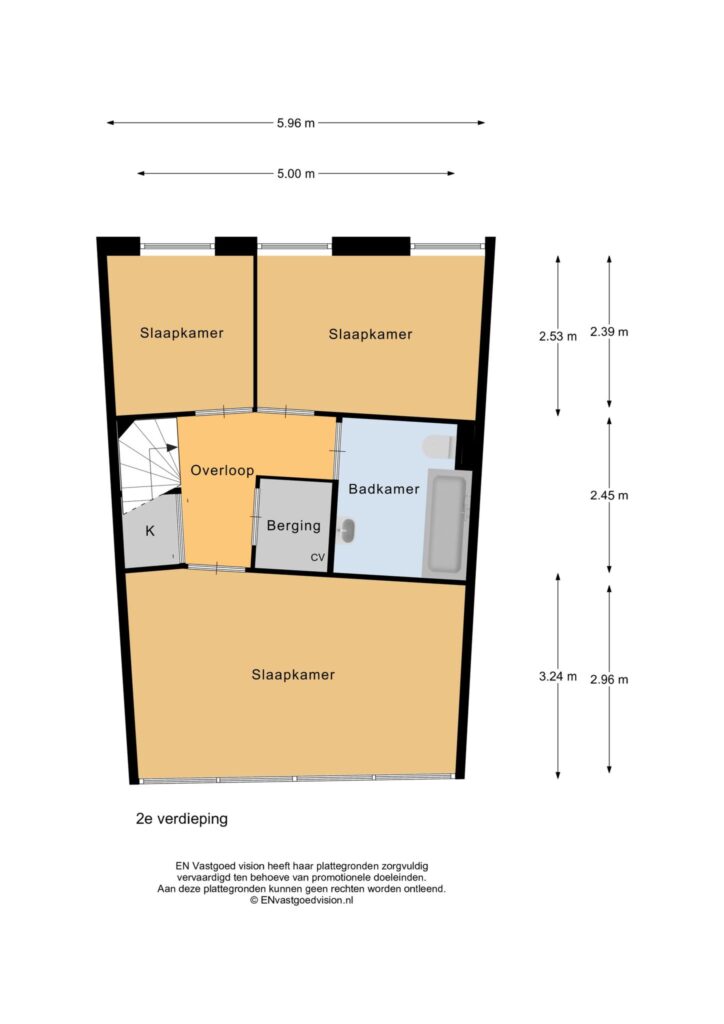 overloop met berg-annex cv-kastruimte met zonneboiler, 3 slaapkamers en een ruime douchekamer met 2e toilet, bad/douchecombinatie en wastafel.