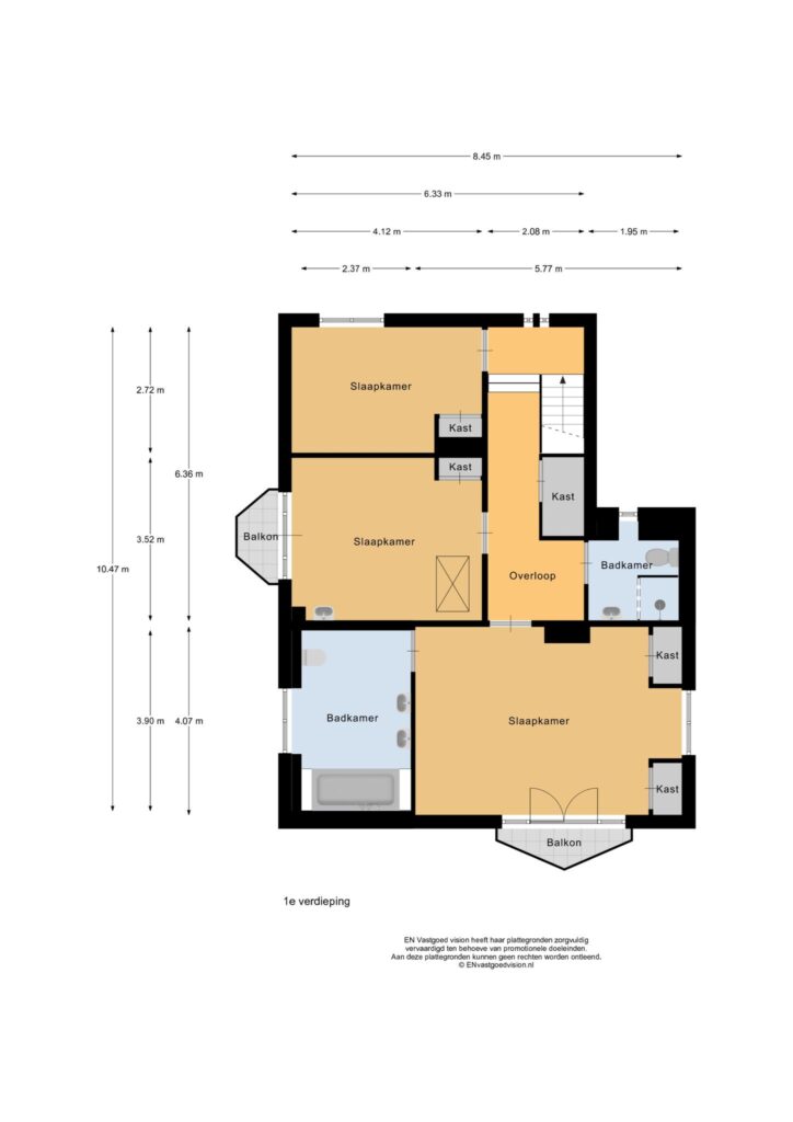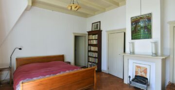 1e Verdieping: via vaste bordestrap naar ruime overloop met prachtige glas-in-lood ramen, grote vaste kast en 3 slaapkamers en 2 badkamers. Eén slaapkamer heeft openslaande deuren naar een klein balkon, de ruime masterbedroom heeft ook een balkon en toegang tot de ruime badkamer en suite met ligbad, toilet en 2 wastafels, er is tevens een separate 2e badkamer met douche, wastafel en toilet.
